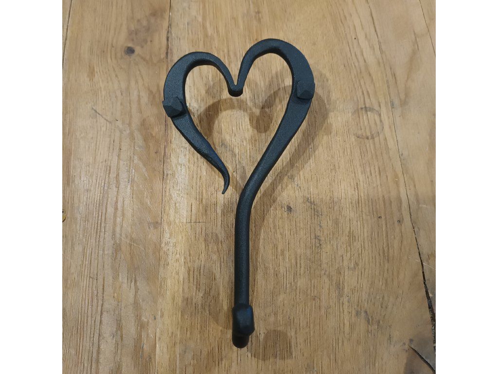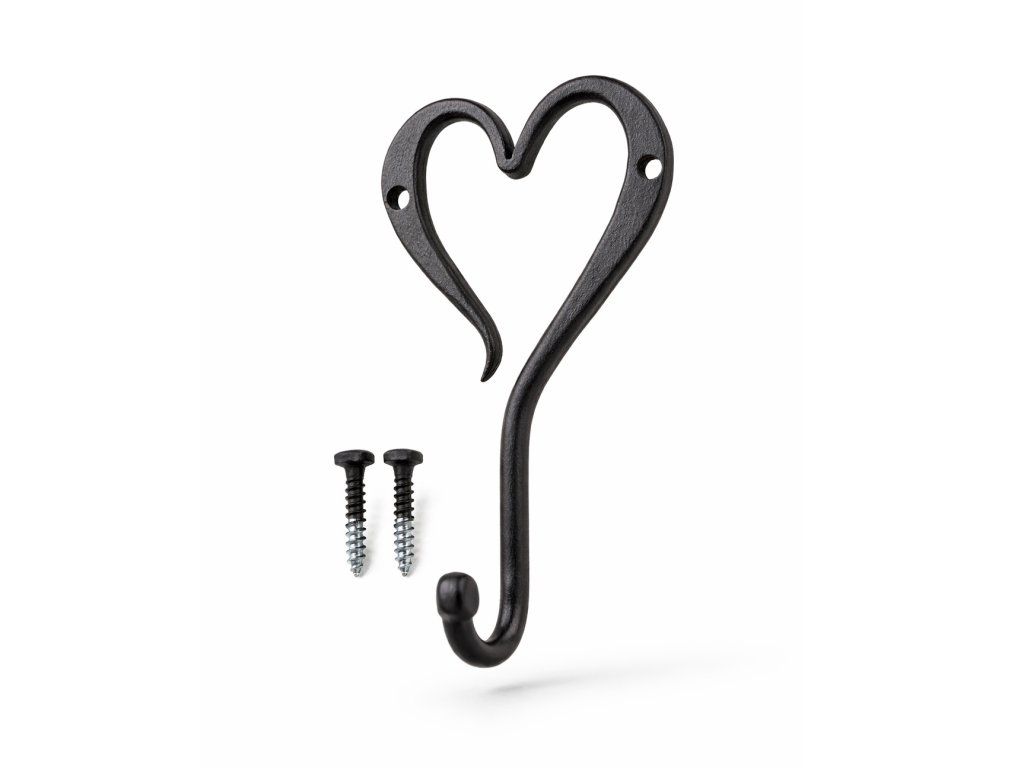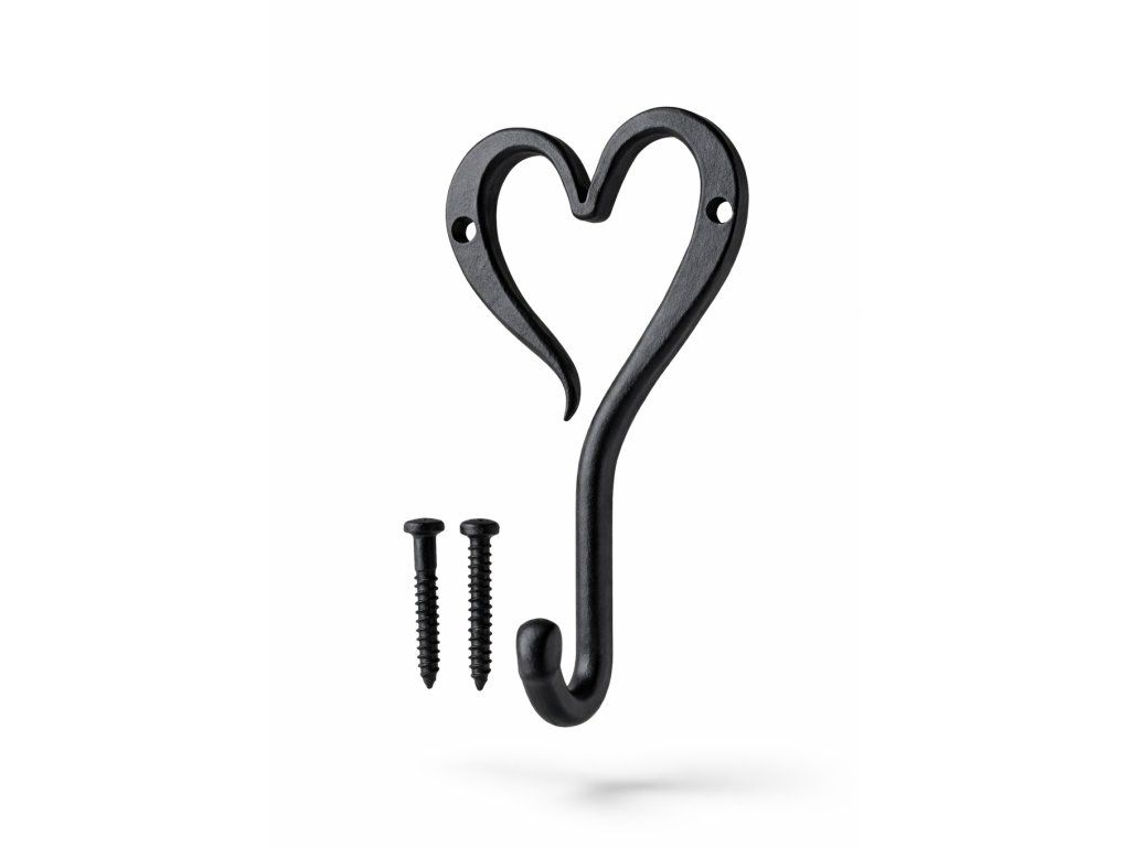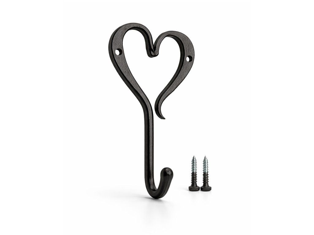 Tento elegantní ručně kovaný černý nástěnný háček + 2 vruty / do dřeva, do zdi / v romantickém designu s motivem srdce je praktickým i dekorativním doplňkem do interiéru. Každý kousek vzniká tradičním kovářským postupem, kdy se kov zahřívá v ohni a následně ručně tvaruje do jemných linií. Díky pevné kované konstrukci s důrazem na detail zajišťuje dlouhou životnost i při každodenním používání. Montáž je velmi snadná. Háček je ideální pro zavěšení kabátů, tašek, utěrek, klíčů nebo drobných dekorací. Uplatnění najde v předsíni, kuchyni, koupelně, ložnici i na chalupě. Dodá Vašemu prostoru praktický detail s nádechem romantiky, který se hodí do rustikálních, venkovských i moderních prostor. Nátěr kovářskou barvou. Materiál: vyrobený z ručně tepaného železa. Rozměr produktu: / v,š,h / cca 15 cm x 8,5cm a 4,5 cm. Nátěr kovářskou barvou. Celková hmotnost 140g .