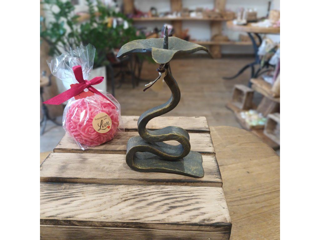 Ručně kovaný svícen s plynule zvlněnou linií, která působí lehce a přirozeně. Dynamicky tvarovaná noha přechází do stabilní podstavy a nahoře je ručně tvarovaná miska se středovým hrotem – svíčka se na něj jednoduše napíchne, takže drží pevně a stabilně při hoření. Každý kus je originál, s jemnými odchylkami typickými pro poctivou ruční práci.